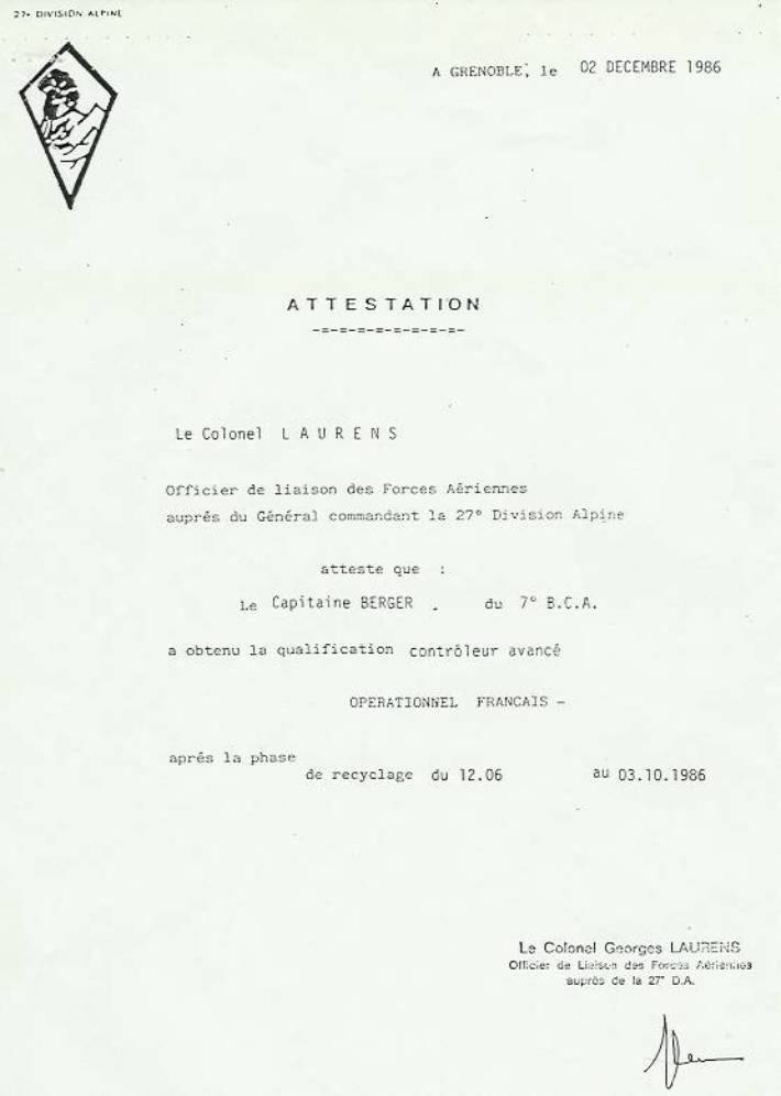 RG... (1) "HAMOUM": Hussein Haroun, j'avais l'habitude de l'avoir en liaison radio de l'OGT sous le code radio "Hamoum", le mien était "Vidame Noir"... (2) Voici la copie de mon diplôme d'officier de guidage aérien... |