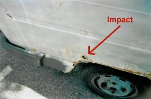 Vous pouvez voir sur le bas de caisse l’impact d’une cartouche de 7,5mm, tirée par un fusil de type « frf2 », dont sont équipés les gendarmes d’élite. |